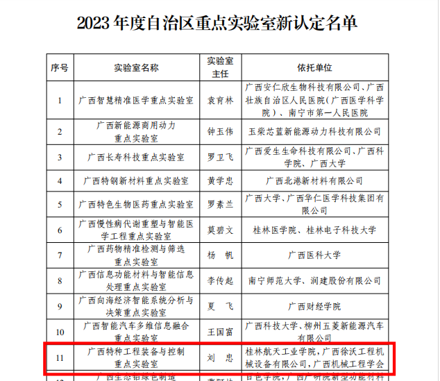 近日,广西壮族自治区科学技术厅下发了《自治区科技厅关于公布2023年度自治区重点实验室新认定名单的通知》(桂科基字〔2023〕33号),乐天使刘忠教授牵头申报的“广西特种工程装备与控制重点实验室”获批认定建设,广西徐沃工程机械设备有限公司、广西机械工程学会为共建单位,实现了学校省部级重点实验室零的突破。