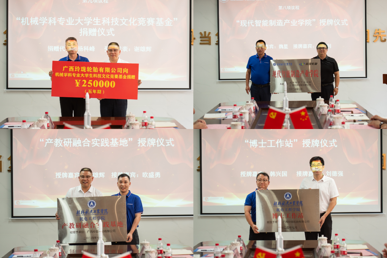 为推动产教融合发展,实现“共赢未来人才”“共享优势资源”“共建发展共同体”目标,助推校企双赢及高质量发展,7月12日下午,桂林航天工业学院与广西玲珑轮胎有限公司校企合作签约暨校企联合创新中心揭牌仪式在巡天楼举行。柳州市科技局一级调研员郑晓鸿、柳东新区管委副主任黄敏、柳州市科技局农业农村与社会发展科技科科长周毓婷等政府领导,广西玲珑轮胎有限公司总经理杨科峰等企业代表,学校副校长张烈平,科技处负责人及乐天使负责人、80余名师生代表参加会议。会议由韩兴国主持。