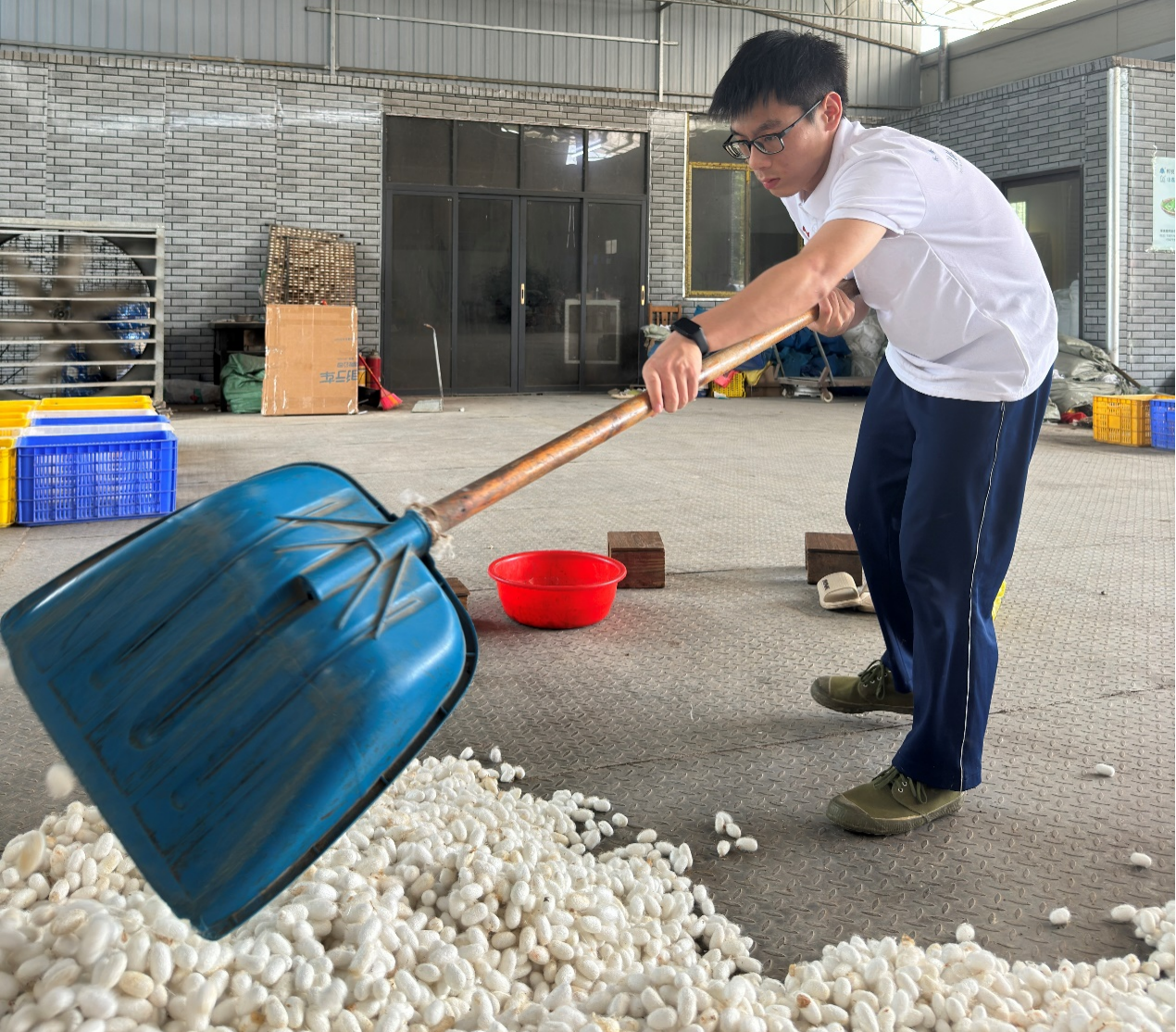 图2实践队成员将挑选好的优质蚕茧铲成堆