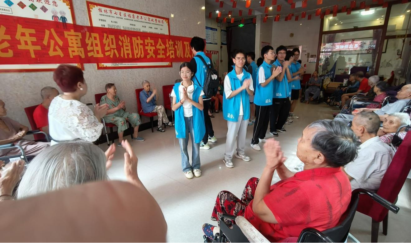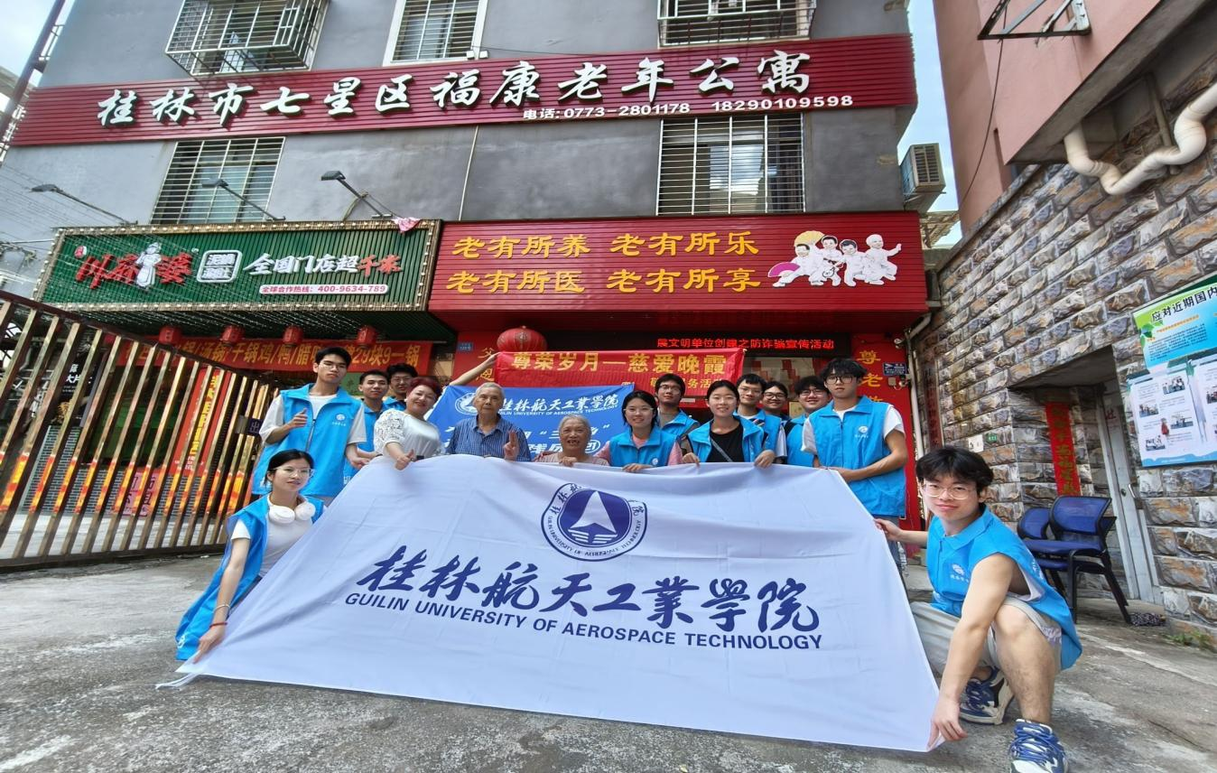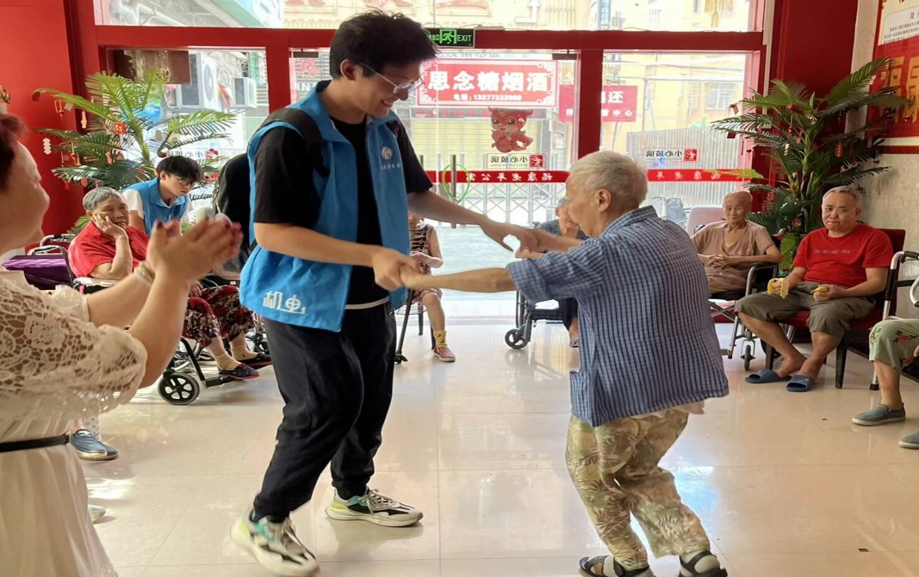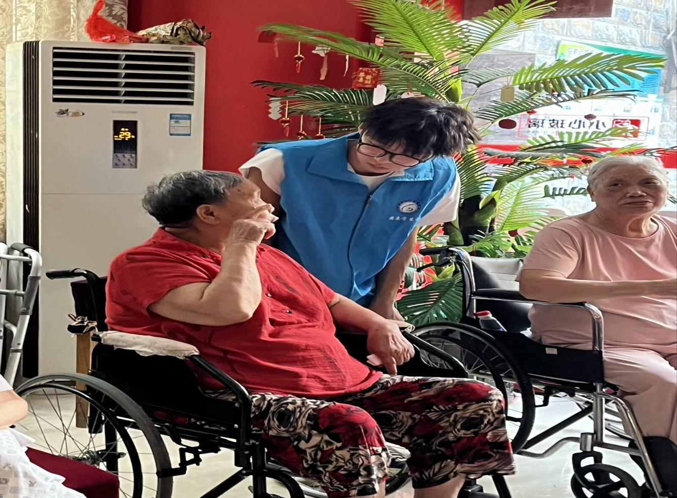 为大力弘扬敬老精神,传承中华民族传统美德,营造友善奉献的社会风尚,传播正能量。2024年7月12日至13日,桂林航天工业学院乐天使“尊容岁月,慈爱晚霞”暑期三下乡实践团队在桂林市七星区福康养老院顺利开展社会实践活动。 有的与老人们交流聊天,倾听他们的心声;有的与老人进行互动,手拉手共同舞蹈。本次活动进一步传承了“尊老、敬老、爱老、助老”的传统美德,让老人们充分感受到社会的关爱和温暖,在大学生心中也播下了爱的种子。