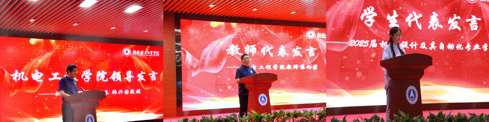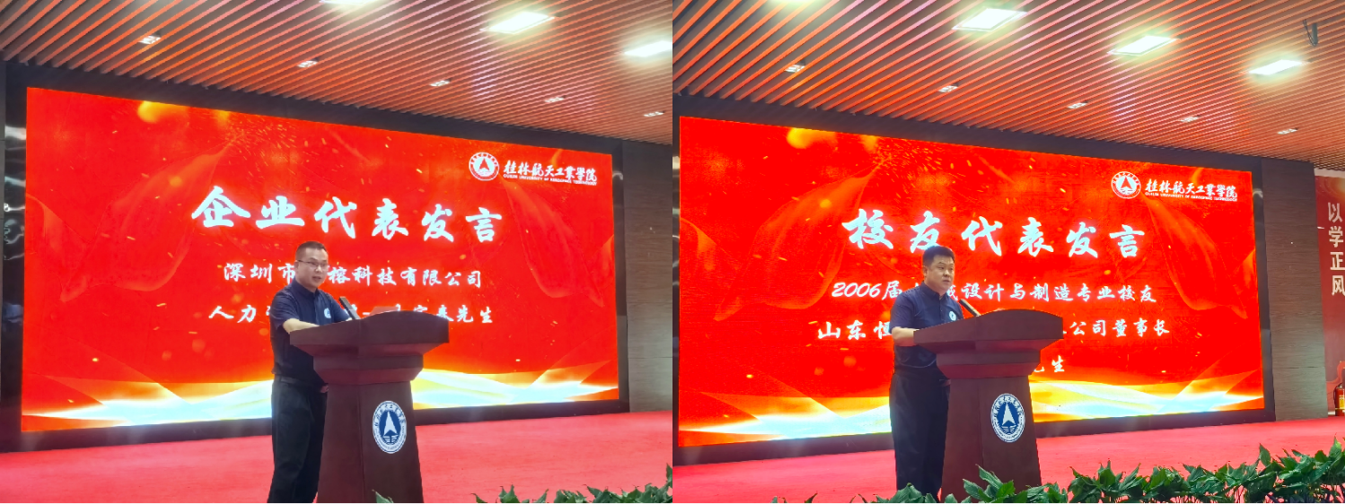 深圳市思榕科技有限公司人力资源总监易家春先生作为企业代表发言,回顾了思榕科技与桂航多年来的合作成果,并展望了未来在人才培养、技术研发等领域的深度合作愿景。山东恒远智能科技有限公司董事长、我校2006届机械设计与制造专业校友张永文分享了创业历程,勉励学弟学妹们以“敢闯敢创”的姿态拥抱时代机遇。乐天使院长韩兴国,副书记马世文,教师代表黎向荣与学生代表李亚萌分别发言,汇报了首届科技文化节的成果及第二届科技文化节年度规划,表达了以科技文化节为契机,践行育人使命、锤炼专业技能的决心。