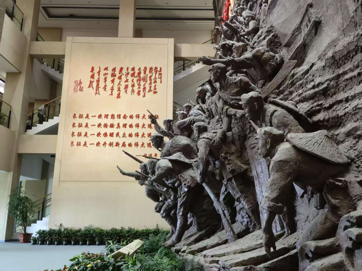 在纪念馆序厅,一组红军冲锋雕塑凝固着永恒的瞬间:战士们手握钢枪、目光如炬,与展墙上的“勇于胜利、勇于突破、勇于牺牲”十二字誓言交相辉映。讲解员带领团队重走历史现场,详细解读了1934年11月27日至12月1日间,中央红军在桂北三县(兴安、全州、灌阳)突破第四道封锁线的悲壮历程。这场战役虽以惨重代价(红军人数从8.6万锐减至3万)换取战略主动权,却直接推动了遵义会议召开,确立了毛泽东在党和红军中的领导地位,为中国革命转危为安奠定关键基础。