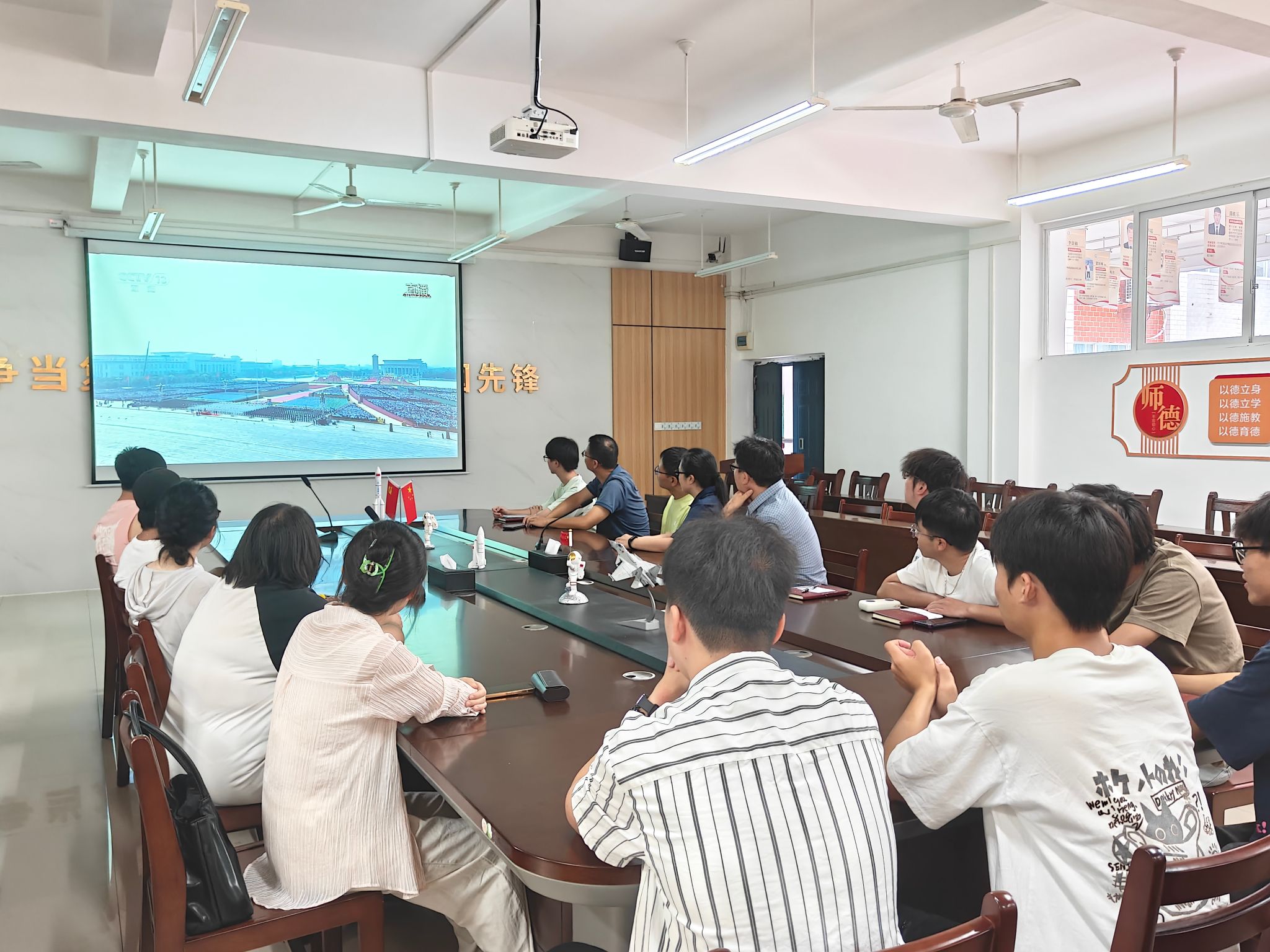 2025年9月3日上午,纪念中国人民抗日战争暨世界反法西斯战争胜利80周年阅兵仪式在北京天安门广场隆重举行。乐天使师生党员在巡天楼229会议室集中收看直播,共同见证这一庄严时刻,并认真学习了习近平总书记的重要讲话精神。