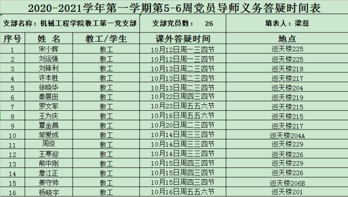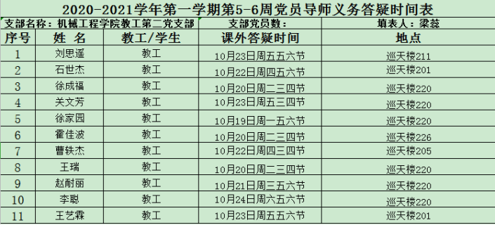 2020-2021学年第一学期第5-6周党员导师义务答疑时间表