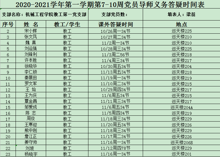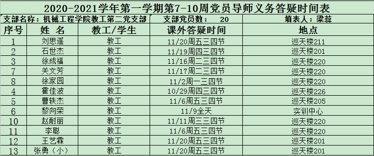 2020-2021学年第一学期第7-10周党员导师义务答疑时间表