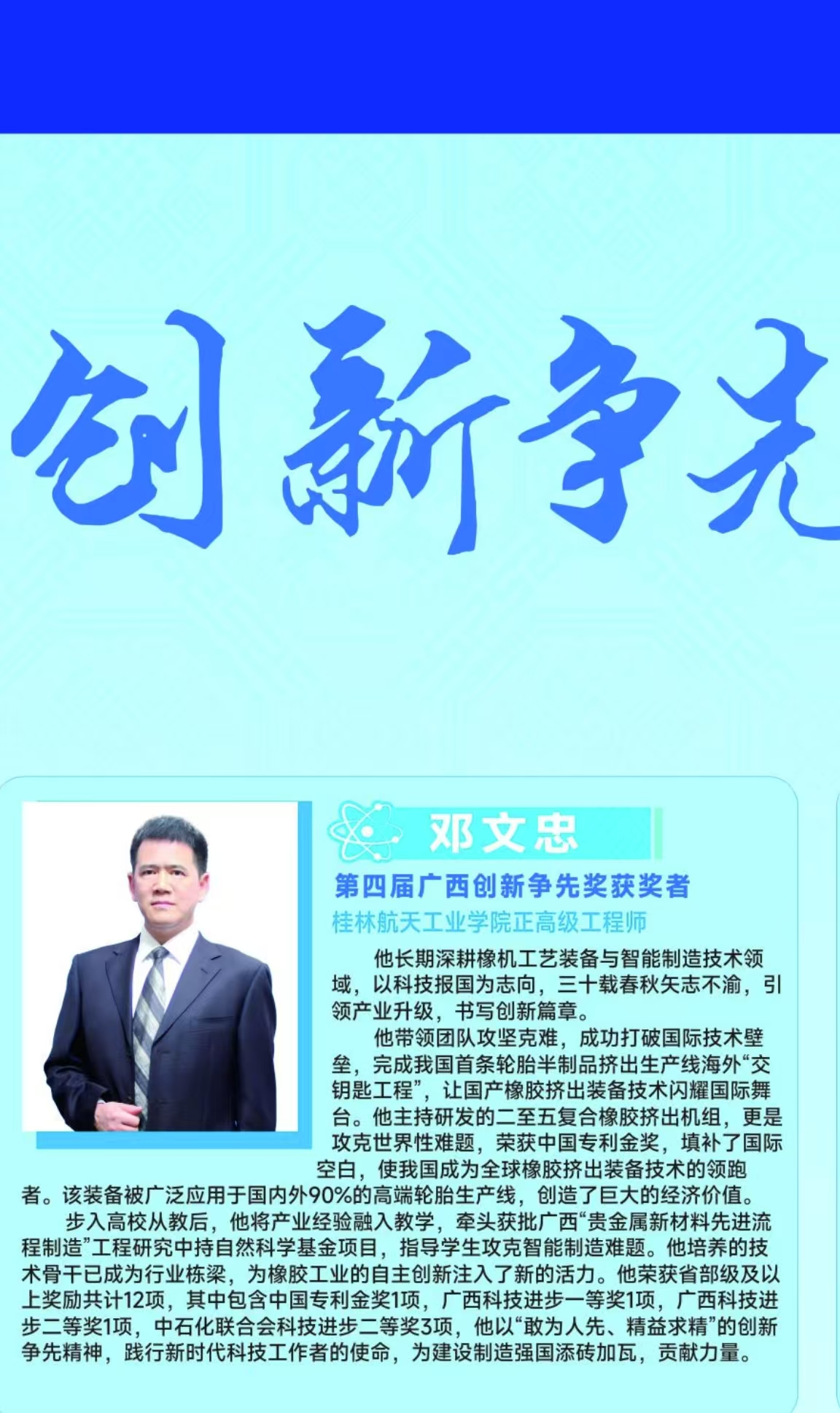 2025年5月29日,在广西科技馆举行的2025年“全国科技工作者日”广西主场活动中,“第四届广西创新争先奖(含广西卓越工程师奖)”颁奖仪式隆重举行。由广西科协主办的这一盛会,旨在表彰在科技创新一线作出突出贡献的科技工作者。桂林航天工业学院乐天使正高级工程师、著名橡胶装备专家邓文忠教授凭借其在橡胶装备领域的卓越成就,荣获“广西创新争先奖”,为学校科研事业再添荣光,也为广西科技创新注入强劲动力。