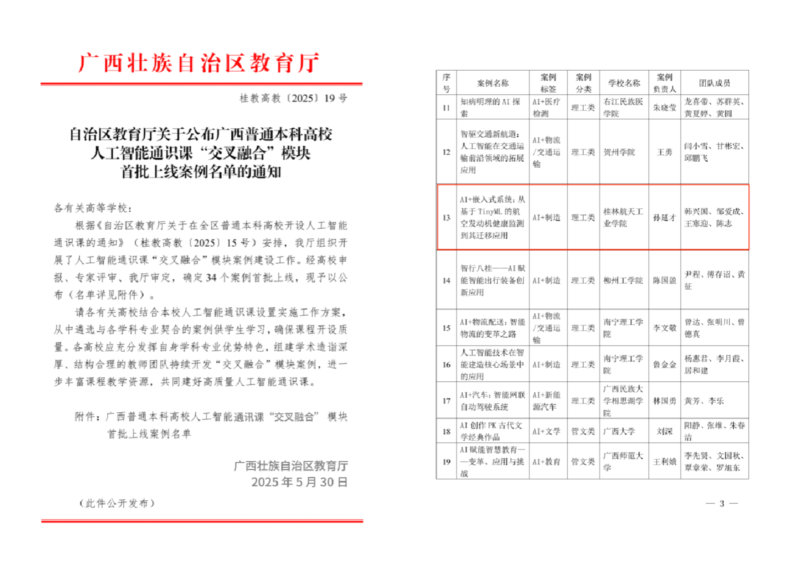近日,根据《自治区教育厅关于公布广西普通本科高校人工智能通识课”交叉融合”模块首批上线案例名单的通知》,我校申报的“AI+嵌入式系统:从基于TinyML的航空发动机健康监测到其迁移应用”案例成功入选首批上线案例名单,本次全区共有34个案例获得认定。