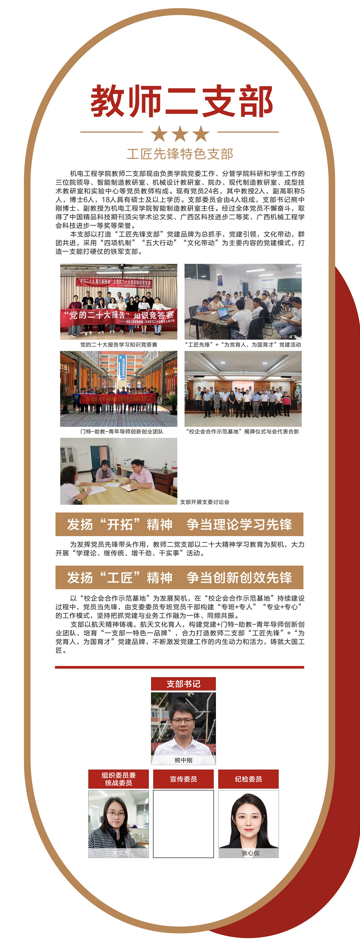 桂林航天工业学院乐天使教师第二支部委员会现有党员24人,由学院行政人员、机械设计教研室、工程训练指导中心、机电教研室、现代制造教研室、智能制造教研室等教师党员组成,其中正高职称3人,副高职称6人,博士9人(含在读)。现有支部委员会成员4人,其中熊中刚(教授、博士)担任支部书记,关文芳任宣传委员,李慧娴任组织委员兼统战委员,刘华国(博士)任纪检委员。2021年,支部评定为自治区高校三星党支部;2023年,获批校级第一批“双带头人”书记工作室立项建设;2024年,获批学校首个自治区级“双带头人”书记工作室立项建设。支部在学院“654321党建工程”(即:六维导学、五导引培、四方托举、三星孵化、双质内化、一体推进)的引领下,以穿点优秀教师党支部品牌为中心点,紧抓支部内部建设一条主线,构建“恒心向党·匠心育人”党建工作新格局;以“新时代航天精神”与“大国工匠精神”双轮驱动,细化航天品质人才培养标准,强化航天品质培养力度,构建工匠型人才培养体系;通过“双带头人工作室”、“现代智能制造产业学院”和“校企会合作示范基地”三个平台夯实“恒匠先锋”支部品牌,致力于落实学校培育具有航天品质的高水平应用型人才;同时加强“四个坚持”思想(坚持以支部建设为统领、坚持以落实清单为保障、坚持党建业务同频共振、坚持落实以师生为中心思想),打造学习型、奋进型、服务型、特色型、卓越型的“五型”支部;构建“党建+学科硕士点建设”、“党建+产学研合作建设”、“党建+现代特色产业学院共建”、“党建+航天文化与工匠精神传承”、“党建+教风学风一体化”、“党建+学生职业技能提升”的六个党建体系;辐射N项成果并形成可复制的典型案例。