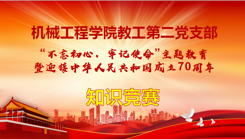 为庆祝中华人民共和国成立70周年,学习宣传党的十九大精神,深入学习贯彻习近平新时代中国特色社会主义思想,调动党员同志读原著、学原文、悟原理的积极性、主动性,为深入开展“不忘初心、牢记使命”主题教育,丰富学习教育形式,推动党员同志学习新思想、践行新理念、展现新作为,机械工程学院教工第二党支部于9月25日下午举办了“不忘初心、牢记使命”主题教育暨迎接中华人民共和国成立70周年党建知识竞赛活动。