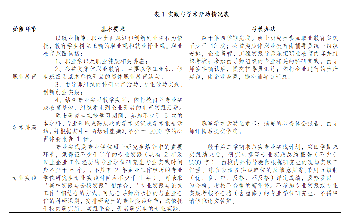 实践和参加学术活动是专业硕士研究生培养的必修环节,在读期间,根据不同情况选择参加社会实践的方式,并提交实践报告。社会实践与学术活动实行学分制。