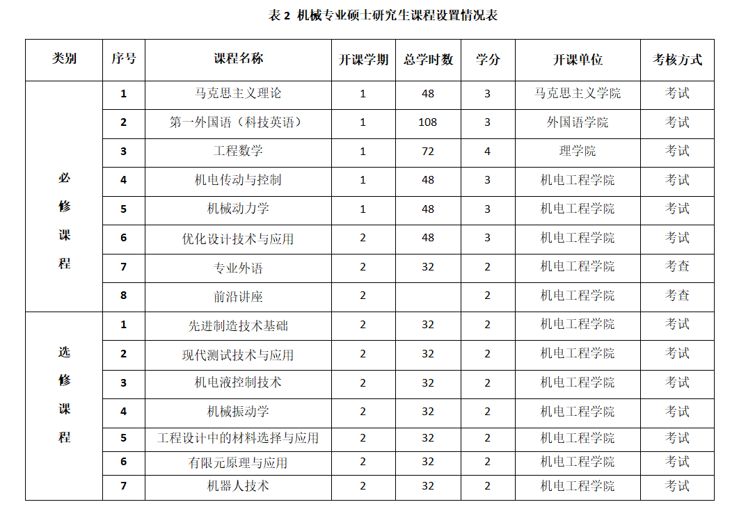 课程学习是机械专业硕士学位研究生掌握较坚实的理论基础和较宽广的专业知识、具备职业要求的知识结构的主要环节。硕士生总学分不少于32学分,其中学位课程学分不少于23学分。课程分为必修课和选修课两大类。